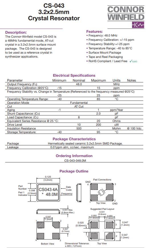 | CS-043-048.0M | Connor-Winfield晶振 | CS-043 | 48MHz | ±25ppm | ±15ppm | 8pF |