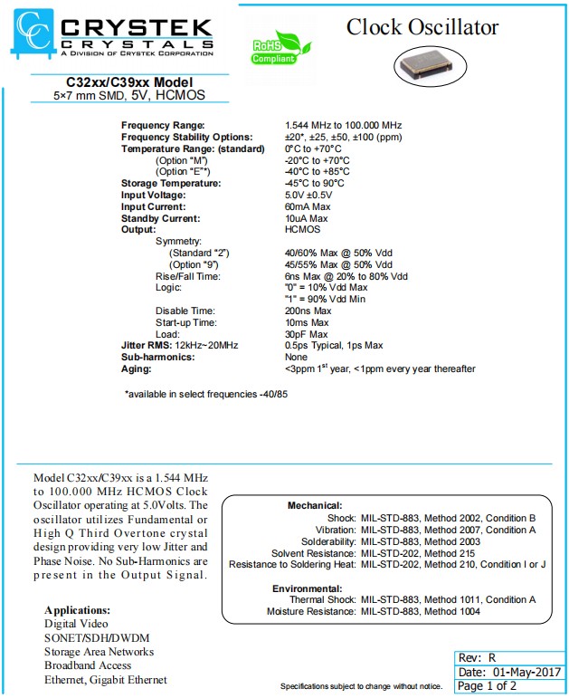 | CE3291-50.000 | Crystek Crystal | C3291 | XO (Standard) | 50MHz |