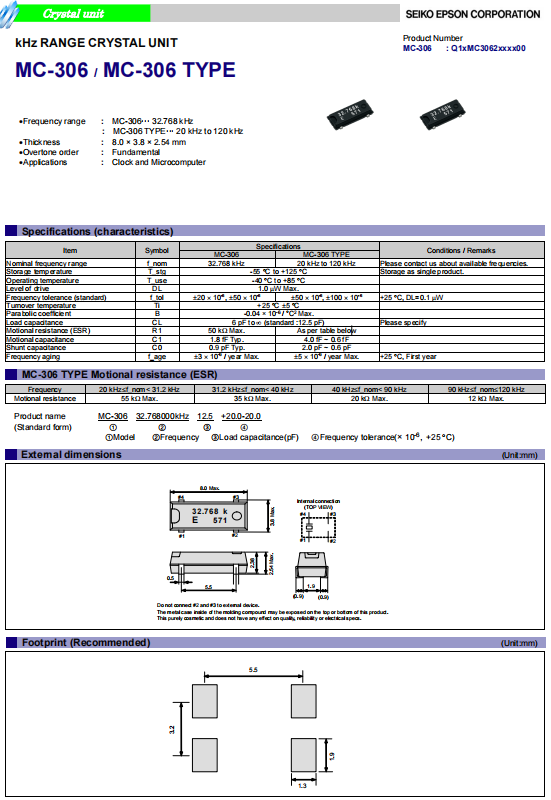 | Q13MC3061006300 | 8 x 3.8 x 2.54 mm | MC-306 | 32.768000 kHz | 9.5 pF | -40 to +85 °C |