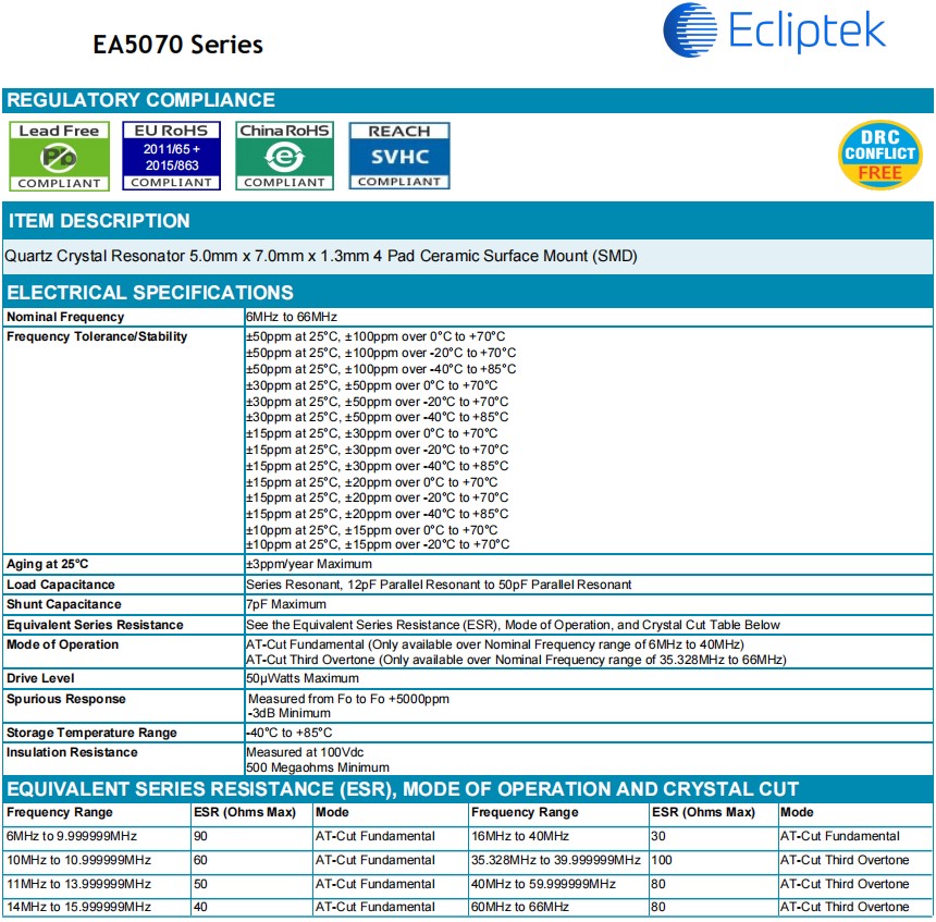 Ecliptek日蝕EA5070晶振,EA5070GA14-6.000M石英晶體諧振器,EA5070GA30-6.000M,7050晶振,Ecliptek日蝕晶振,美國進口貼片晶振,EA5070是一款小體積晶振尺寸7.0x5.0mm晶振,四腳貼片晶振,無源晶振,石英晶振,石英晶體諧振器,無鉛環保晶振,頻率6MHZ,負載7pF,精度20ppm,工作溫度0°C ~+70°C,石英晶振,采用優異的原料結合高超的生產技術打磨而成,產品具備高質量低損耗的特點,非常適合用于辦公自動化,家電領域,移動通信領域可發揮優良的電氣特性,符合無鉛標準,滿足無鉛焊接的回流溫度曲線要求,金屬外殼的石英晶振使得產品在封裝時能發揮比陶瓷晶振外殼更好的耐沖擊性能。應用于通訊設備晶振,無線網絡晶振,藍牙模塊晶振,汽車電子,醫療設備,數碼電子,安防設備等應用。
