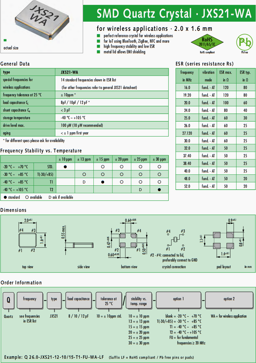 | Q 26.0-JXS21-9-10/10-FU-WA-LF | Jauch晶振 | JXS21-WA | 26MHz | ±10ppm | 9pF |