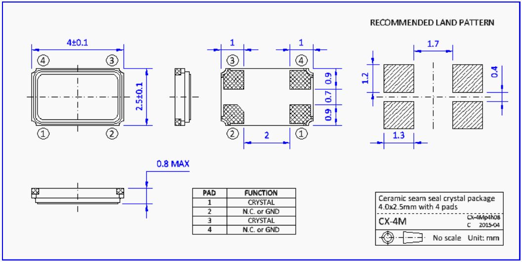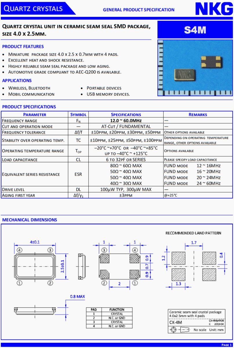 NKG進(jìn)口晶體,S4M25.0000F18E23-EXT環(huán)保晶振,車載收音機(jī)晶振。NKG晶振公司,無線傳輸晶振,汽車藍(lán)牙晶振,移動(dòng)通訊晶振,便攜設(shè)備晶振,USB存儲設(shè)備晶振。4025晶振,小體積晶振,超薄晶振,貼片晶振,進(jìn)口晶振,石英晶振,高品質(zhì)晶振低損耗晶振,汽車級晶振,車載音響系統(tǒng)晶振。石英晶體單元在陶瓷縫密封SMD封裝,尺寸4.0 x 2.5mm。S4M。產(chǎn)品特點(diǎn):微型包裝尺寸為4.0 x 2.5 x 0.7mm,帶有4個(gè)襯墊。優(yōu)異的耐熱性和抗震性。高可靠的縫封封裝,低老化。符合AEC-Q200標(biāo)準(zhǔn)的汽車級產(chǎn)品可供選擇。