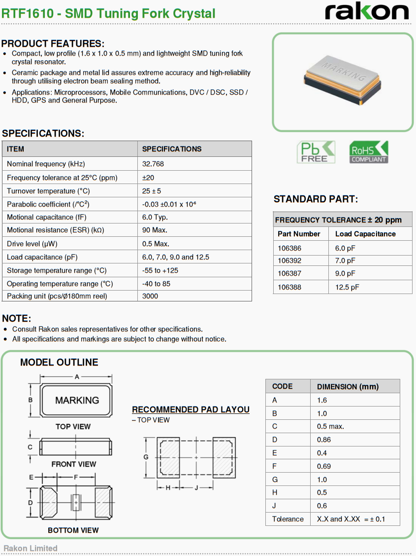 Rakon瑞康晶振,6G信號(hào)接收器晶振,RTF1610二腳晶振,新西蘭瑞康晶振,Rakon晶振,進(jìn)口晶振,歐美晶振,6G信號(hào)接收器晶振,二腳晶振,32.768K晶振,石英晶振,貼片晶振,無源晶振,緊湊,低輪廓(1.6 x 1.0 x 0.5毫米)和輕量級(jí)SMD音叉晶體諧振器。陶瓷封裝和金屬蓋通過電子束密封方法確保極高的精度和高可靠性。應(yīng)用:微處理器,移動(dòng)通信,DVC / DSC, SSD /HDD, GPS和通用。