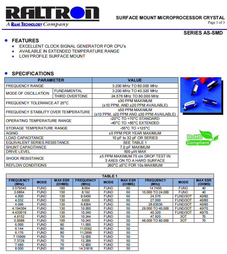 | AS-4.000-18-SMD-TR | AS-SMD | 4.000MHz | 13.50 x 4.80mm | ± 30 ppm | ± 50 ppm | 18 pF |