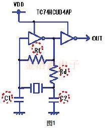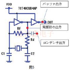 設(shè)計(jì)振蕩器電路時(shí),有必要認(rèn)識(shí)到各個(gè)組件的作用.因此,表1中以振蕩電路(圖1)為例,以通用C-MOSIC(東芝74HCU04AP)為例說明了每個(gè)電路的作用.