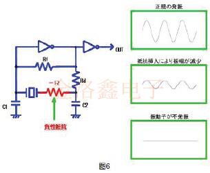 這是為了確認(rèn)晶振振蕩電路具有多少振蕩余量,并且根據(jù)所獲得的值來預(yù)測振蕩穩(wěn)定性的測量.如圖6所示,如果將一個(gè)電阻器(R)與振動(dòng)器串聯(lián),并且該值增大,則振動(dòng)器將不會(huì)在某個(gè)電阻值以上振蕩.即將停止振蕩之前的電阻值為負(fù)電阻值.