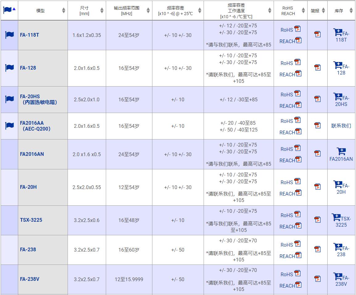 | 愛普生晶振原廠編碼 | 封裝尺寸 | 型號 | 頻率 | 頻率容許偏差 | 工作溫度 |