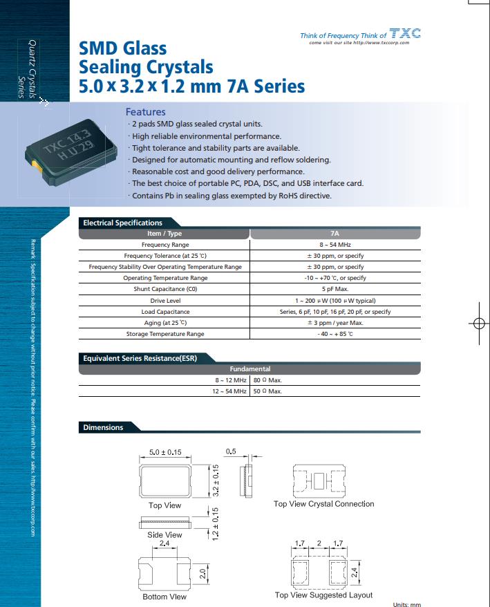 | 7A-8.000MAAJ-T | TXC晶振 | 7A | 8MHz | ±30ppm | -20°C ~ 70°C |