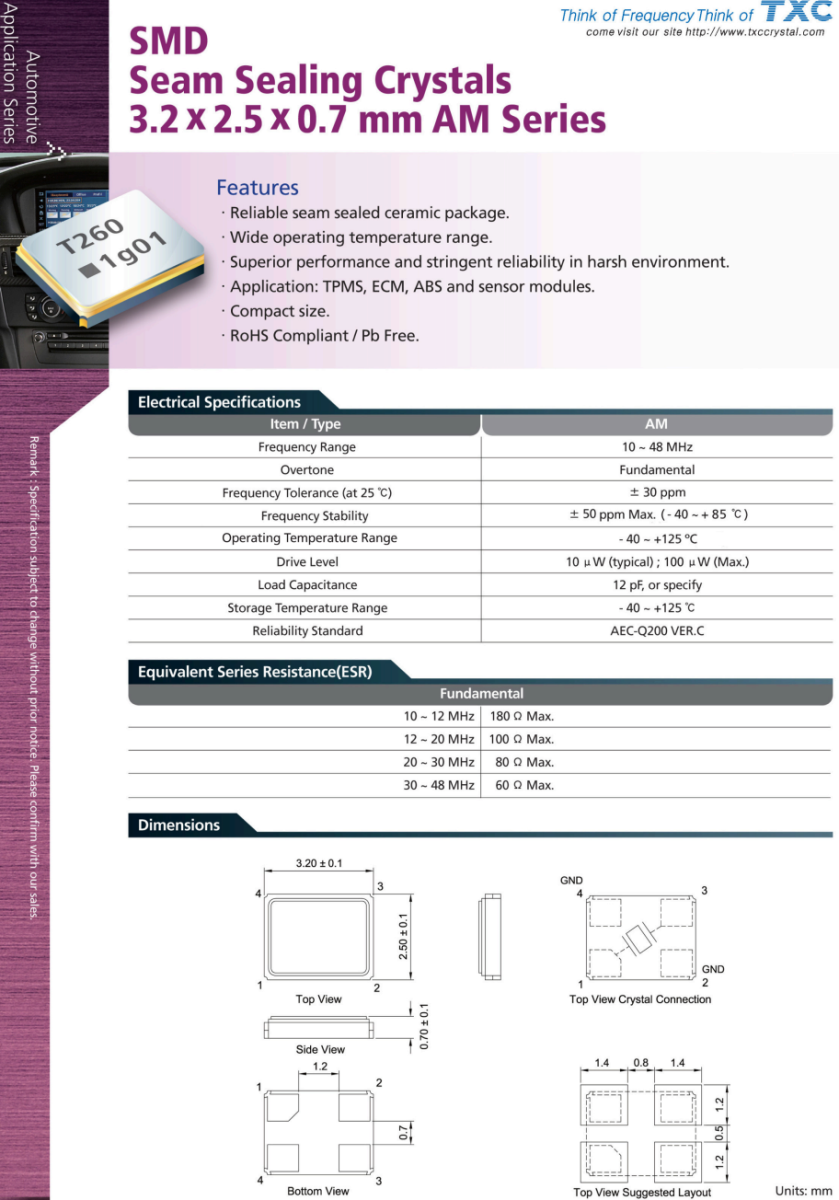 AM-48.000MAGE-T晶振,臺(tái)灣晶技晶振,汽車藍(lán)牙模塊晶振,臺(tái)灣TXC晶振,AM-48.000MAGE-T晶振,3225晶振,寬溫,汽車級(jí)晶振,無源晶振,無源晶振,石英晶體諧振器,四腳貼片晶振,超小型晶振,小型汽車晶振,車載收音機(jī)晶振,實(shí)時(shí)時(shí)鐘晶振,藍(lán)牙模塊晶振.特點(diǎn)可靠的縫密封陶瓷封裝。.工作溫度范圍寬。惡劣環(huán)境下的卓越性能和嚴(yán)格的可靠性應(yīng)用領(lǐng)域: TPMS,ECM,ABS和傳感器模塊。體積小巧。符合RoHS標(biāo)準(zhǔn)/不含Pb。AM系列貼片,接縫密封晶體,3.2 x2.5 x0.7毫米