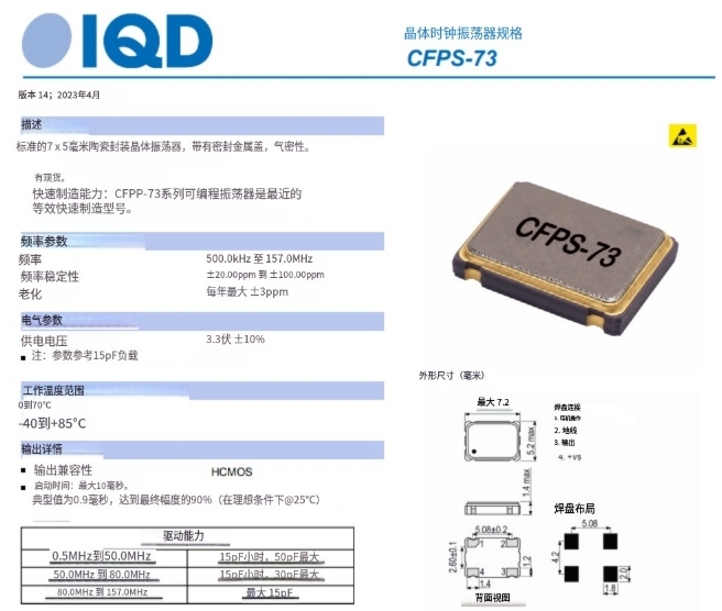| LFSPXO018041REEL | IQD 進口晶振 | CFPS-73 | XO (Standard) | 4 MHz | HCMOS | 3.3V | ±50ppm |