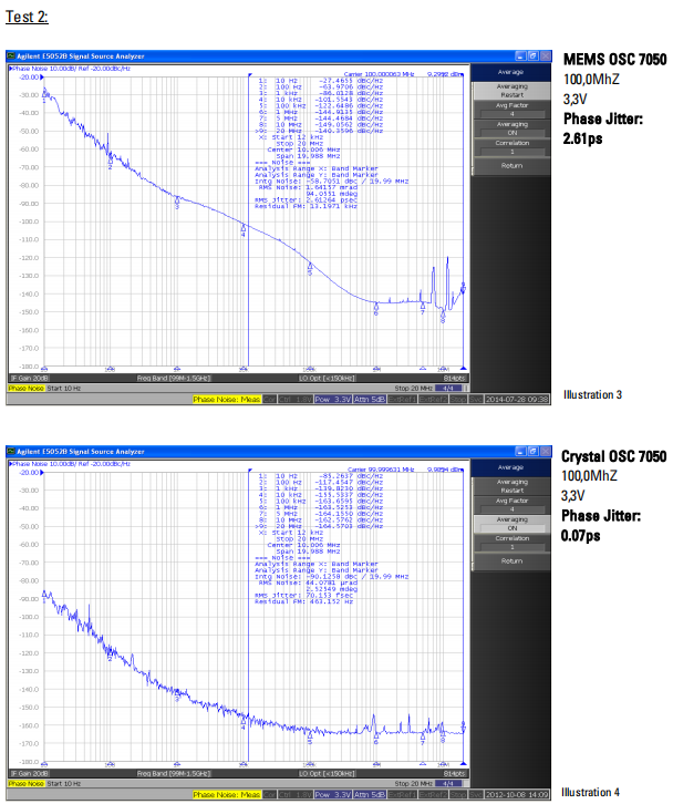 | 6. Phase noise | Crystal OSC is better as MEMS OSC (pls, refer to “test data”) | ||