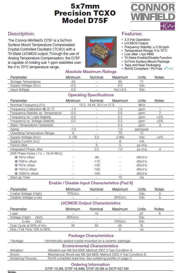 康納溫菲爾德利用自身獨特的優勢,開發性價比超高的有源晶振編碼D75F-027.0M,型號D75F,頻率為27MHZ,D75F是一個5x7mm的表面安裝溫度補償晶體三態可控振蕩器(TCXO溫補晶振)LVCMOS輸出。通過模擬的使用溫度補償,D75F是有能力在0至70°C范圍內保持低于1ppm的穩定性溫度范圍內。