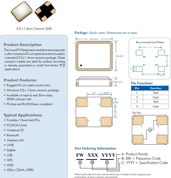 | FW1600010 | Diodes晶振 | SaRonix-eCera™ FW | MHz Crystal | 16MHz | ±20ppm |