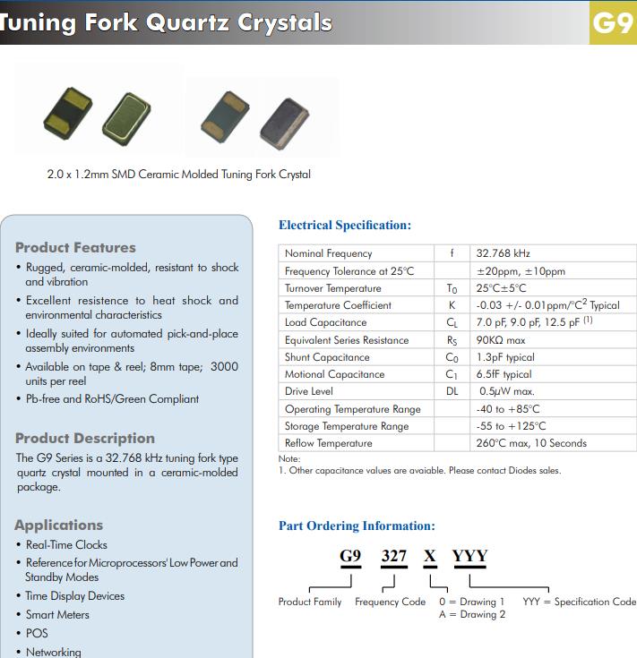 G9系列為32.768 kHz音叉型石英晶體安裝在陶瓷模塑包中。