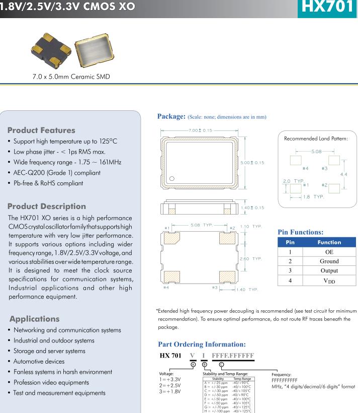 HX701 XO系列是高性能的CMOS晶體振蕩器家族,支持具有極低抖動性能的溫度。它支持各種選項,包括更廣泛頻率范圍,1.8V/2.5V/3.3V電壓,和在較寬的溫度范圍內具有多種穩定性。它是為滿足時鐘源而設計的通信系統規范,工業應用等較高設備性能。