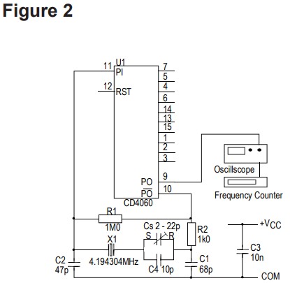 如果需要可微調振蕩器,22pF輸出電容可以 由一個與2pF至22pF并聯的固定10pF電容代替 微調器。為獲得最佳結果,應使用NPO、COG或類似的低溫高效電介質電容,以獲得最佳穩定性。