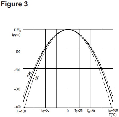 另一個重要的影響是由于溫度的變化。 手表晶體和其他類似類型低于1兆赫有一個拋物線 設計翻轉溫度為25°C時的頻率-溫度特性(見圖3)。人員流動的容忍度 溫度和拋物線曲率常數,通常為3℃ 和0.038 ppm/ C2,這意味著精密公差可以 只能在有限的溫度范圍內維持。這沒什么 結果在一只手表,當然,因為在使用中它保持接近 水晶的周轉溫度,但它可以呈現這種選擇晶體類型的成本效益低于AT切割單位,如果操作 希望溫度范圍比0到50℃更寬。4.194304MHz (32.768kHz x 27) AT切割晶體的類似電路 如圖2所示,C3和C4是為了便于精確 在標準時鐘下校準的晶體的頻率調整 12pF的晶體負載。如果不需要修整,則更換它們 具有18pF或22pF固定單元的電容器(選擇 導致最接近標稱頻率的振蕩),或者省略它們 并指定在30pF負載下校準的晶體。