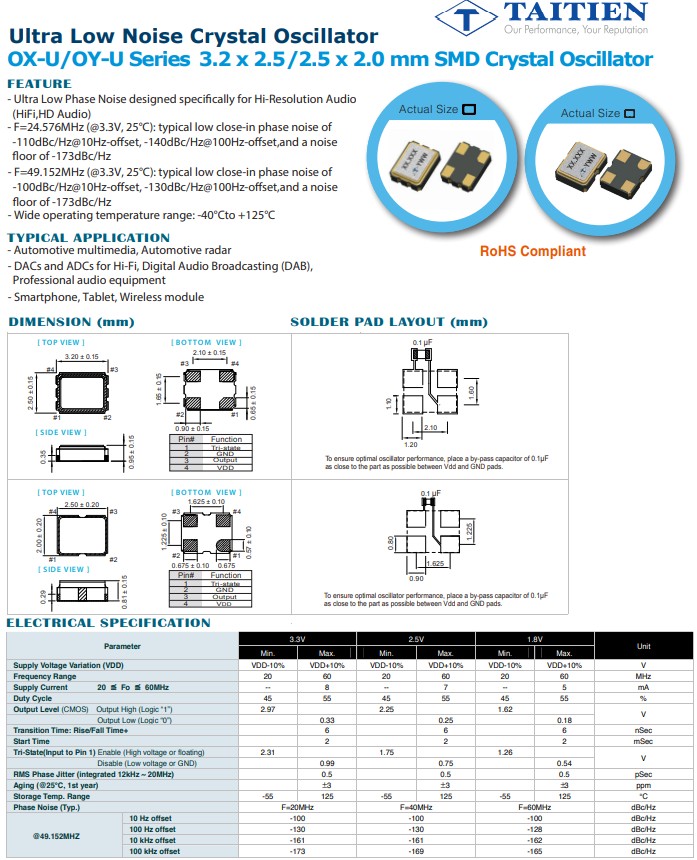 超低噪聲晶體振蕩器 OX-U/OY-U系列3.2 x 2.5/2.5 x 2.0毫米SMD晶振,專為高分辨率音頻(高保真、高清音頻)設(shè)計的超低相位噪聲,寬工作溫度范圍:-40 至 +105°C,特征: