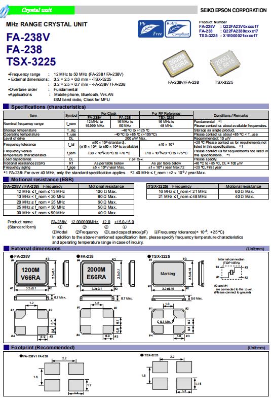 | Q22FA2380105616 | 3.2 x 2.5 x 0.7mm | FA-238 | 16.384000 MHz | 10 pF | +/-30 ppm | +/-30 ppm | -20 to +70 °C | ≤ 80 Ω |