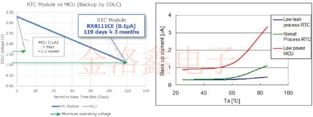 EPSON的RTC模塊可以以比MCU的睡眠模式低一個數量級的電流消耗來保持時間信息.最小時鐘電壓高達1.1V.此外,低泄漏IC使高溫工作期間的電流消耗最小.EPSON在睡眠時極大地有助于降低客戶系統的功耗. 溫度變化時提供高精度的時間信息: