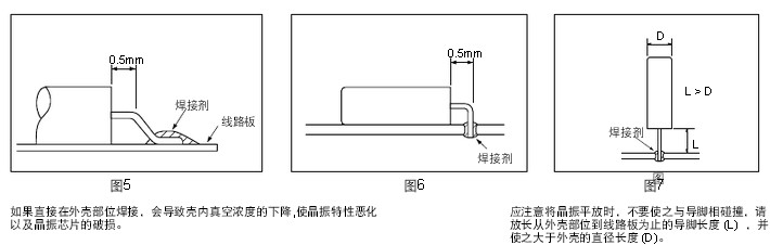 另外,如果利用高溫或長時間對導腳部位進行加熱,會導致晶振特性的惡化以及晶振的破損。因此,請注意對導腳部位的加熱溫度要控制在 300°C以下,且加熱時間要控制在5秒以內 (外殼的部位的加熱溫度要控制在150°C以下)。