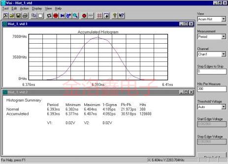 理想的時(shí)鐘信號(hào)為155.52MHz,對(duì)于一個(gè)完整的周期,其周期為6430皮秒.“無噪聲”波形的連續(xù)周期將精確測(cè)量為6430皮秒.會(huì)導(dǎo)致時(shí)鐘周期從6430pS變化的噪聲元素被稱為抖動(dòng).抖動(dòng)由確定性(來自電源噪聲等特定原因)和隨機(jī)內(nèi)容組成.抖動(dòng)的隨機(jī)部分可以使用高斯分布統(tǒng)計(jì)來表征.例如,僅包含隨機(jī)抖動(dòng)元素的155.52MHz石英振蕩器的周期的三百次連續(xù)測(cè)量將顯示為高斯分布(具有一個(gè)峰值).正負(fù)一個(gè)標(biāo)準(zhǔn)偏差將包含所有周期測(cè)量數(shù)據(jù)點(diǎn)的68.26%: