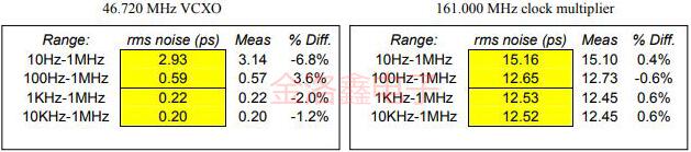 相位噪聲測(cè)試系統(tǒng)沿對(duì)數(shù)標(biāo)度繪制頻率,每十年至少應(yīng)選擇3個(gè)點(diǎn).例如,為了獲得均勻分布的點(diǎn),我們選擇使用10、20、50、100、200…等方法.點(diǎn)越多,相關(guān)性越好.剩下的就是取求和的平方根,然后除以(2*PI*Fo).我們已經(jīng)描述了使此任務(wù)輕松實(shí)現(xiàn)以電子表格實(shí)現(xiàn)或?qū)⑵渚幋a為BASIC或C程序所需的所有步驟,下面列出了以下結(jié)果,將該方法與Aeroflex PN9000相噪測(cè)試儀進(jìn)行了比較,使用n=16點(diǎn)10Hz至1MHz. [供應(yīng)商與客戶之間抖動(dòng)抖動(dòng)的相關(guān)性]