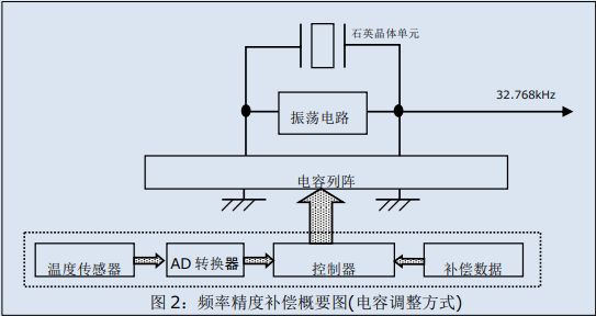 該方法每隔一定周期將周圍溫度信息轉換成數字,從內存中呼出該溫度相應的補償值,對振蕩頻率進行補償。振蕩頻率補償方 式可分為兩大種類:電容調整方式和邏輯調整方式。愛普生實時時鐘模塊中主要使用電容調整方式。在后面中說明補償方式。