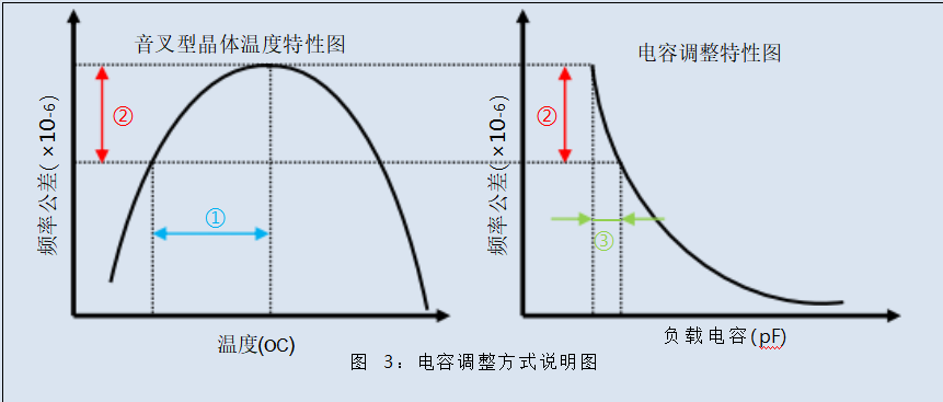 電容調整方式指通過改變石英振蕩頻率進行補償的方法。該方式利用振蕩頻率隨石英晶體振蕩器的振蕩負載電容的增減而變化 的特點,補償因周圍溫度而產生的頻率變動。簡易原理用圖 3 表示。