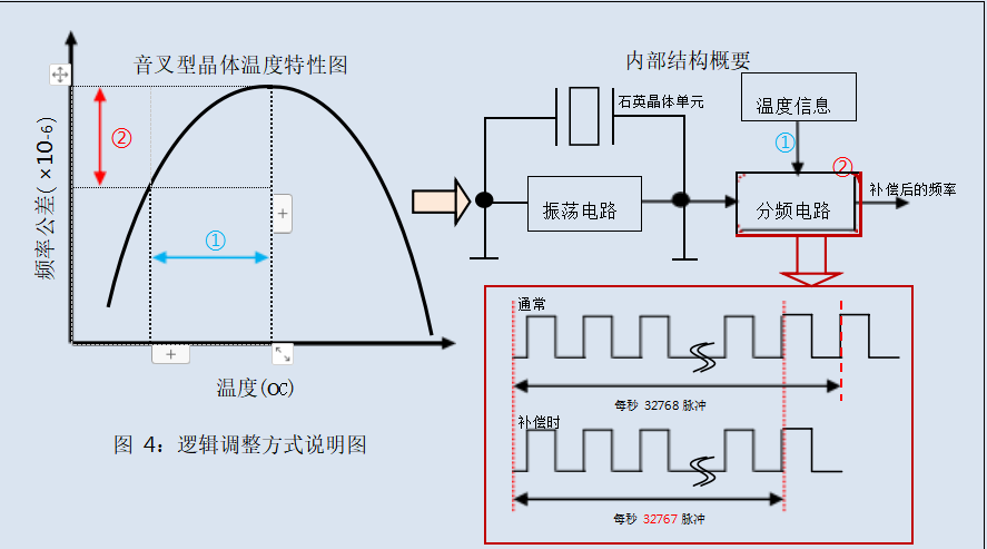 邏輯調整方式指不調整石英晶體振蕩器的頻率而起振,在分頻電路的一部分增減脈沖進行補償的方法。簡易原理用圖 4 表示。 補償的具體內容包括根據周圍溫度①求出頻率變量②,在分頻電路中對該頻率變量②相應的頻率進行補償后輸出。 如圖 4 所示,通常由 32768 個脈沖生成“1 秒”的時間,若改為由 32767 個脈沖生成“1 秒”信號,就可以縮短 1 秒的周期。 假如以每秒一次的頻度執行該補償,其頻率補償量則相當于約 30.5×10-6。通過調整生成 1 秒的脈沖數以及變更補償頻度,就可 以在不更改振蕩電路的條件下進行較大的補償。而且,該方式使用邏輯電路進行調整,最終將正確輸出轉動時鐘的 1 秒信號,因 而被廣泛用于以 1 秒工作的手表等的時鐘源。然而,輸出到外部的時鐘信號周期因溫度補償而急劇變化,因此將導致使用該時鐘 的 CPU 不能以正確時間工作,使用這種補償方式時周圍的元器件將無法享受其恩惠。