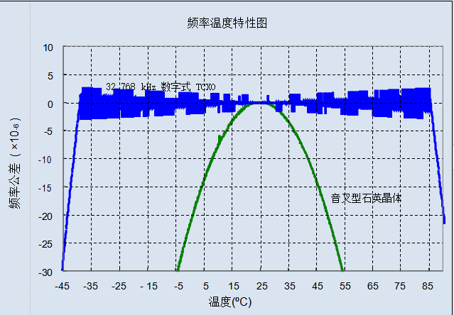圖 5 表示使用數字式 TCXO 進行頻率精度補償(電容調整方式)的愛普生實時時鐘模塊的頻率溫度特性。