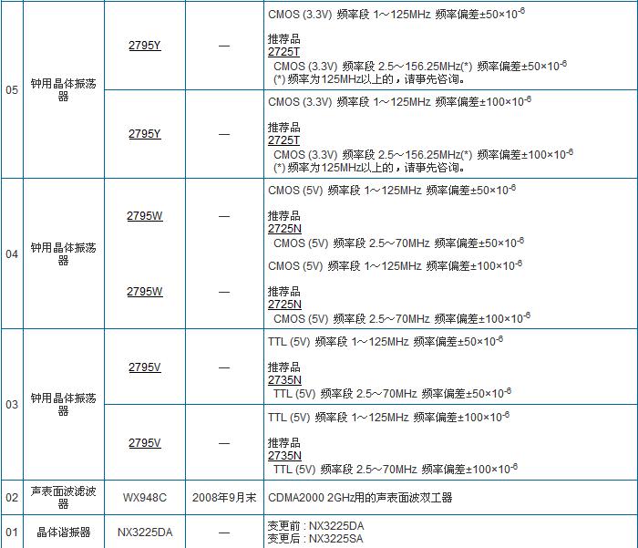 許多人認(rèn)為購買晶振時(shí)最麻煩的莫過于沒有現(xiàn)貨了,這個(gè)問題同時(shí)也在困擾著我們這些晶振銷售員,畢竟多買出去一點(diǎn),我們就多一些收入。進(jìn)口晶振交期周期長是常有的事,不過這些交期長些都算好的了,部分石英晶振因?yàn)樵谑忻嫔险也粴ぷ雍途荒芡V股a(chǎn)。例如之前日本的NDK晶振公司就公布了55款停產(chǎn)晶振型號,同時(shí)還有一些可替代原產(chǎn)品的石英晶體料號。