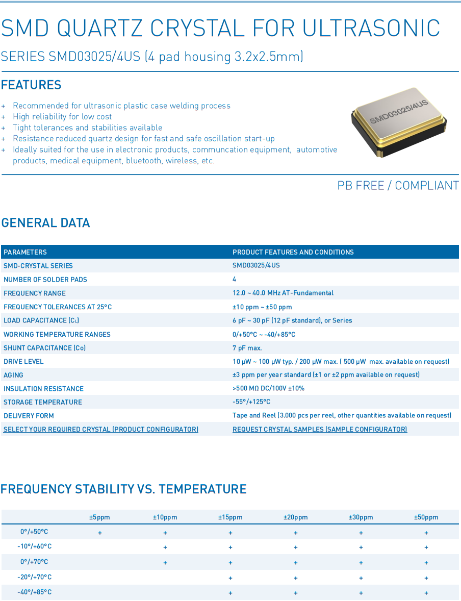 The SMD quartz suitable for ultrasonic from the “SMD03025/4US” series can be welded and cleaned by ultrasonic. In doing so, this quartz, whose quartz resonator has a special fixed ultrasonic limit, is designed for ultrasonic frequencies of 15 kHz, 20 kHz, 35 kHz and 40 kHz.