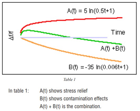 當施加應力時,石英晶體會改變頻率。這種壓力可以來自于任何一種或所有的幾種來源。封裝和安裝,環氧樹脂連接,金屬薄膜,和石英本身可以是應力的來源。如果應力在該部件的使用壽命中是恒定的,則頻率將保持不變。然而,在現實世界中,壓力會隨著時間的推移而放松,因此,壓力相關的就會老化。